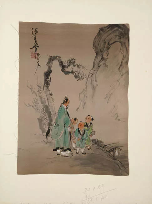 Composición en base a una vista lateral de una casa. Presenta dos plantas con un frontis de pasillos abiertos con columnas, cuatro ventanas, techo a dos aguas y en la parte posterior de la segunda planta cuatro mamparas. Se encuentra rodeada de vegetación. Manchas con predominio de los colores marrón, naranja y verde. Contornos lineales color negro.
