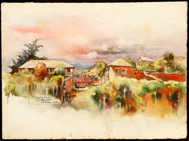 Composición en base a un paisaje rural. Presenta un camino central en perspectiva. A ambos costados, en planos sucesivos, árboles que proyectan su sombra en el camino. Al costado izquierdo, casas y cuatro postes eléctricos. último plano, cerros y cielo. Manchas con predominio de los colores marrón, verde y naranja. Cielo. rojo, azul y violeta sobre fondo blanco. Algunos contornos lineales color negro.