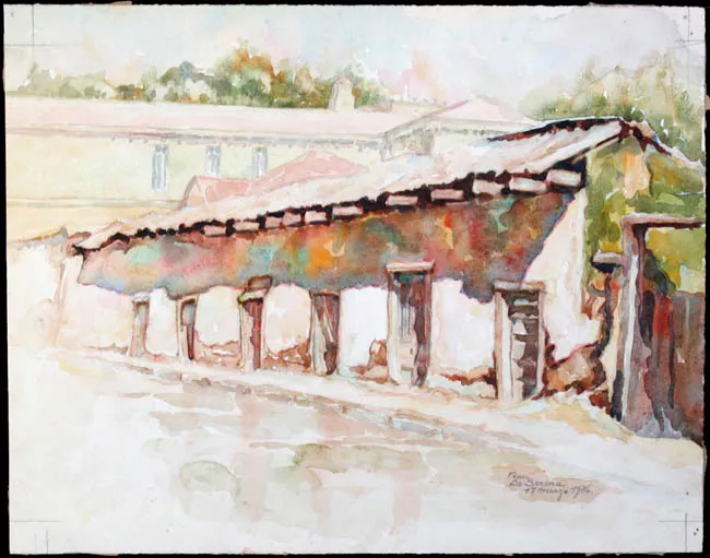 Composición en base a un paisaje con casas. En primer plano, presenta dos casas con techo a dos aguas de paja. En segundo plano, pendiente con árboles y vegetación. Plano posterior, cerro y cielo. Manchas con predominio de los colores marrón, verde y naranja. Algunos contornos lineales color negro.