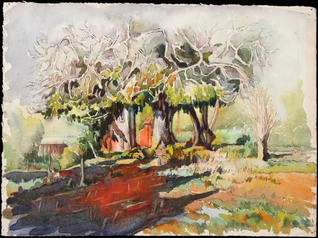 Composición en base a un paisaje urbano. Presenta una vista lateral de una calle con casas en planos sucesivos. Las casas, tienen techo a dos aguas, puertas y ventanas. Plano posterior, cielo. Manchas con predominio de los colores marrón, ocre y naranja. Cielo rojo. Fondo blanco. Algunos contornos lineales color negro.