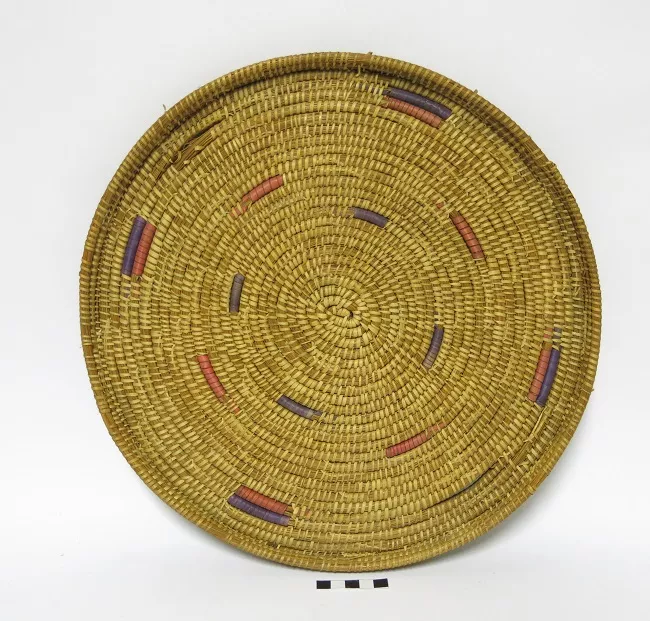 Recipiente de forma circular, base plana, tejida con técnica de espiral, (aduja) con fibras vegetales coirón y ñocha, sin decoración.