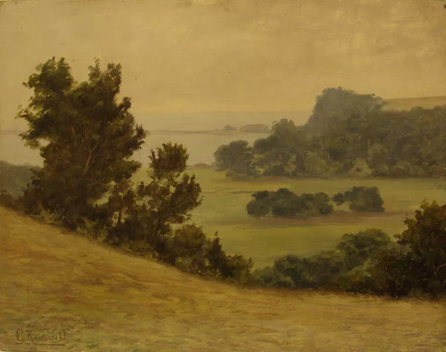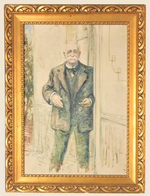 Obra de formato rectangular, disposición horizontal. Composición en base a zona urbana. En primer plano se observa un monumento con un caballo montado por un jinete, la base es de color blanco, el caballo y jinete son de color negro, alrededor del monumento en la parte inferior de la obra, se observa un conjunto de figuras humanas poco definidas de color negro. Al costado derecho se visualizan tres árboles, de follajes amarillo, blanco y rojizo. En segundo plano al costado izquierdo de la obra, se distinguen edificaciones de color gris y al costado derecho se vislumbra una edificación color café oscuro. De fondo, la mitad superior de la obra es de color blanco con tintes rojizos y en la parte inferior se distingue un color verde claro. Al costado inferior izquierdo de la obra, una firma.