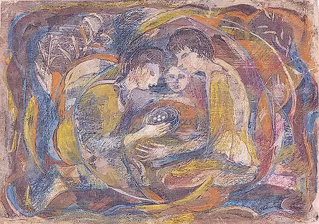 Obra de formato rectangular. Composición en base a tres figuras de niñ...