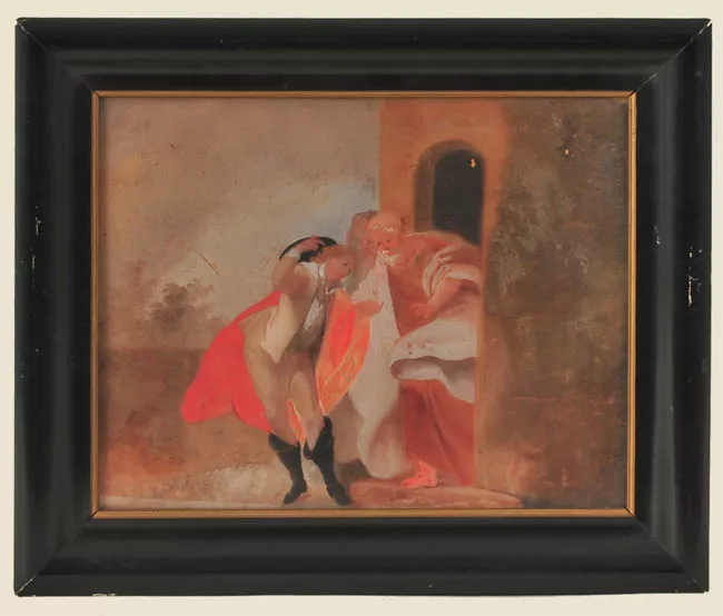 Obra de formato cuadrado compuesta por dos cuadrados de tela. El de mayor tamaño está en su posición original. Sobre este un cuadrado más pequeño, rotado en cuarenta y cinco grados, con retrato de figura femenina de medio cuerpo y medio perfil. Los bordes de la figura están pintados de negro. La figura es de tez clara, cabello negro, ojos azules y labios rojos. La boca está abierta y deja ver una sonrisa blanca. Tiene puesto un vestido azul, un delantal blanco, un sombrero del mismo color y un collar de perlas blancas en el cuello. Con su mano izquierda en alto sostiene una pequeña caja que tiene representada su propia imagen. Fondo color ocre y bordes blancos. Sobre toda la composición, con letras imprentas minúsculas de color blanco, la palabra: asunción. En el reverso del cuadrado pequeño, dos varillas de madera pegadas uniendo sus vértices.