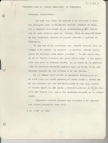 Palabras para el hogar americano en Venezuela [manuscrito] Gabriela Mistral.