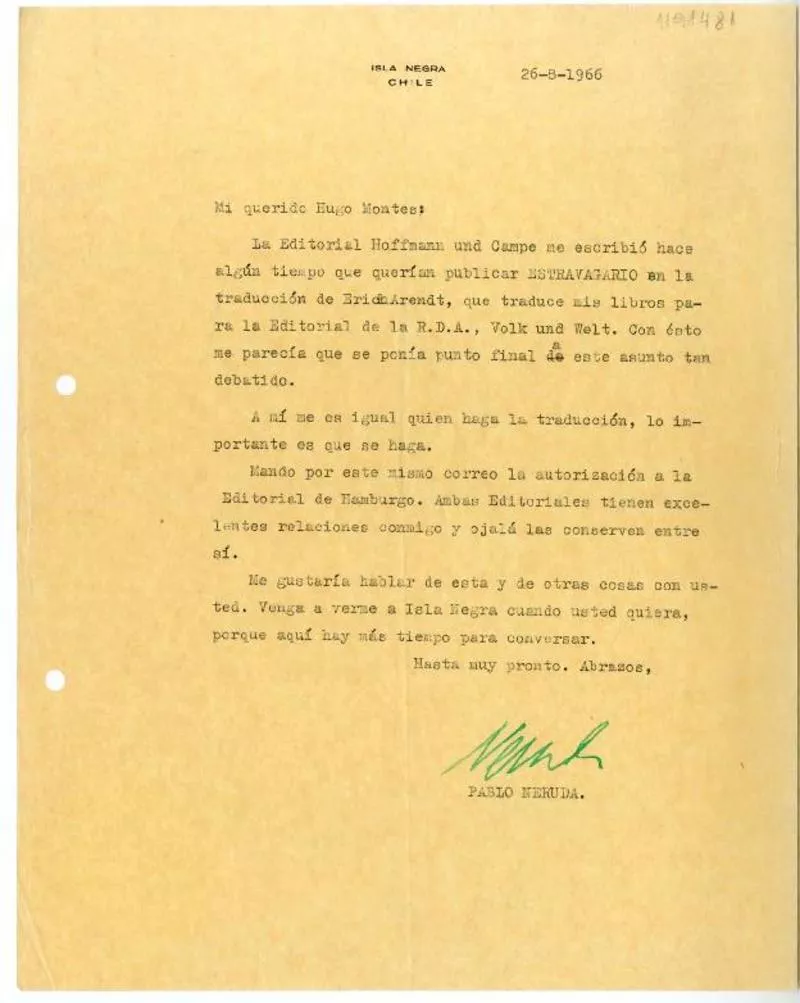 Isla Negra, Chile [a] Hugo Montes [manuscrito] Pablo Neruda. 1 hoja ; ...