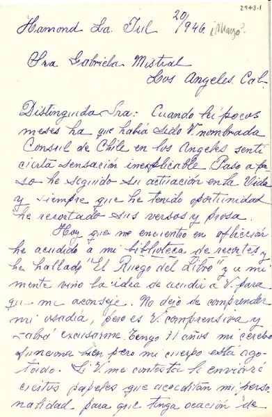 [Carta] 1946 jul. 20, Hamond, La., [EE.UU.] [a] Gabriela Mistral, Los ...
