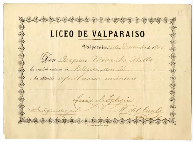 [Diploma] 1900 diciembre 15, Valparaíso, [Chile] [a] Joaquín Edwards Bello [manuscrito] Liceo de Valparaíso.