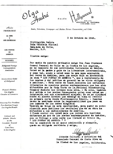 [Carta] 1949 oct. 3, Los Ágeles, California [a] Gabriela Mistral, México D.F. [manuscrito] Olga André.