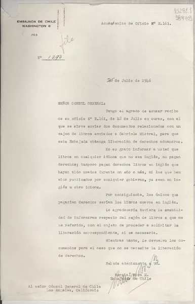 [Circular] N° 1390, 1946 jul. 25, Washington [al] Señor Cónsul General de Chile, Los Angeles, California [manuscrito] Marcial Mora M.