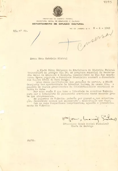 [Carta] 1943 abr. 8, Río de Janeiro [a] Gabriela Mistral [manuscrito] Francisco Gomes Maciel Pinheiro.