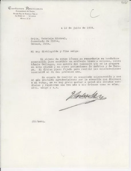 [Carta] 1954 jul. 12, México D. F. [a la] Srita. Gabriela Mistral, Consulado de Chile, Habana, Cuba [manuscrito] Jesús Silva Herzog.