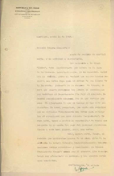 [Carta] 1954 jul. 12, México D. F. [a la] Srita. Gabriela Mistral, Con...