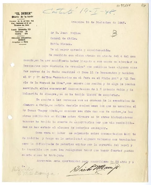 [Carta] 1947 diciembre 10, Arequipa, Perú [a] Juan Mujica, Bahía Blanca, Argentina [manuscrito] Víctor Manuel Barriga.