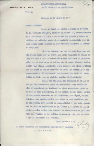 [Oficio] N° 2515, 1937 ene. 30, Lisboa, [Portugal] [al] Señor Ministro de Relaciones Exteriores y Comercio, Santiago, [Chile] [manuscrito] / L. Godoy.