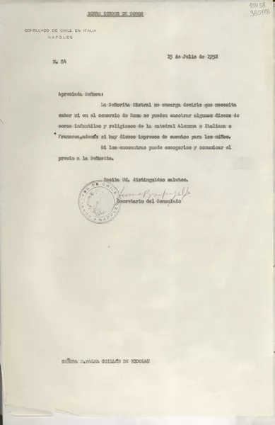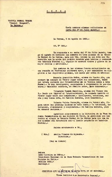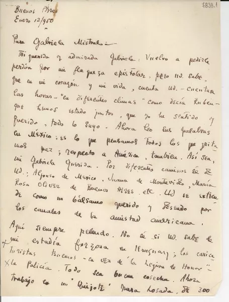 [Carta] 1947 oct. 27, United Nations Appeal for Children, Lake Succes, New York, [EE.UU.] [a] Doña Gabriela Mistral, 729 E. Anapamu Street, Santa Barbara, California, [EE.UU.] [manuscrito] Alberto Ortega, Representante en la América Latina de "United Nations Appeal for Children".