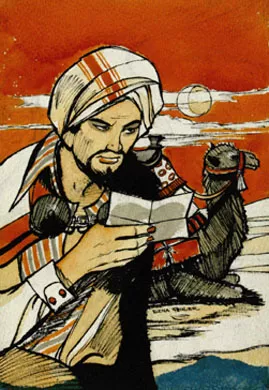 Dibujo de un hombre con barba y turbante sosteniendo un papel con su m...