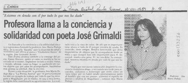 Profesora llama a la conciencia y solidaridad con poeta José Grimaldi [artículo].