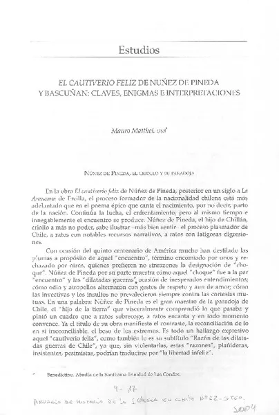 El Cautiverio Feliz de Núñez de Pineda y Bascuñán: claves, enigmas e interpretaciones. [artículo] Mauro Matthey