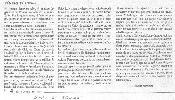 Hasta el lunes. [artículo] Gonzalo Contreras