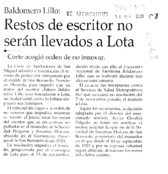 Restos de escritor no serán llevados a Lota [artículo]