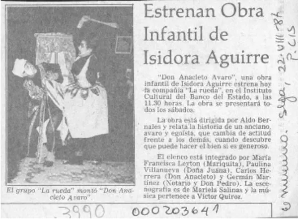 Estrenan obra infantil de Isidora Aguirre [artículo]. retr.