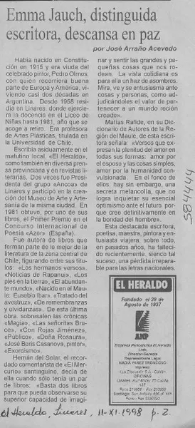 Emma Jauch, distinguida escritora, descansa en paz [artículo] José Arraño Acevedo