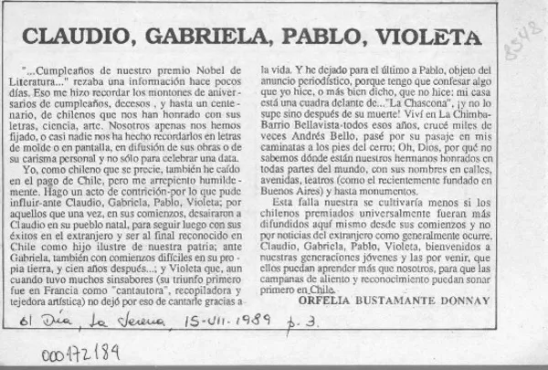 Claudio, Gabriela, Pablo, Violeta [artículo] Orfelia Bustamante Donnay.