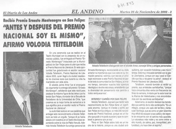 "Antes y después del Premio Nacional soy el mismo", afirmó Volodia Teitelboim. [artículo]