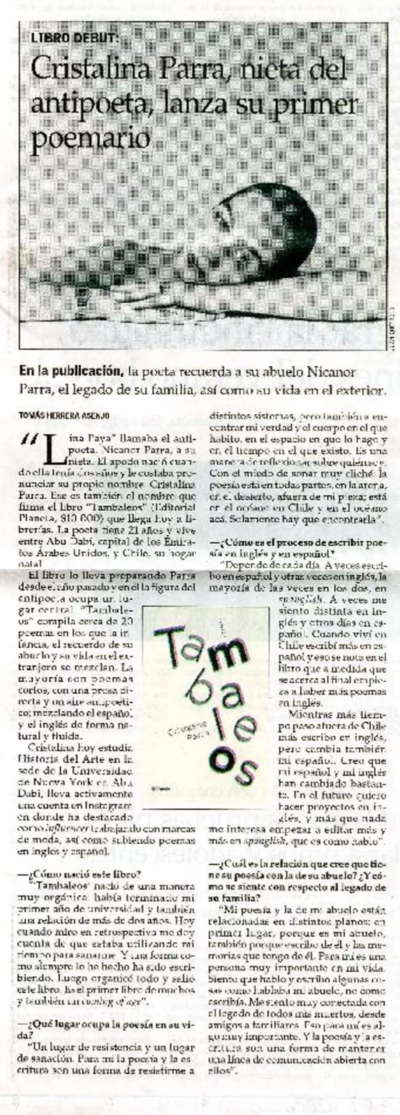 Cristalina Parra, nieta del antipoeta, lanza su primer poemario [entrevista] [artículo] : Tomás Asenjo Herrera.