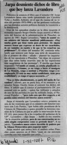 Jarpa desmiente dichos de libro que hoy lanza Lavandero [artículo].