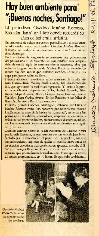 Hay buen ambiente para "Buenas noches, Santiago!" [artículo]. retr.