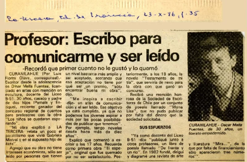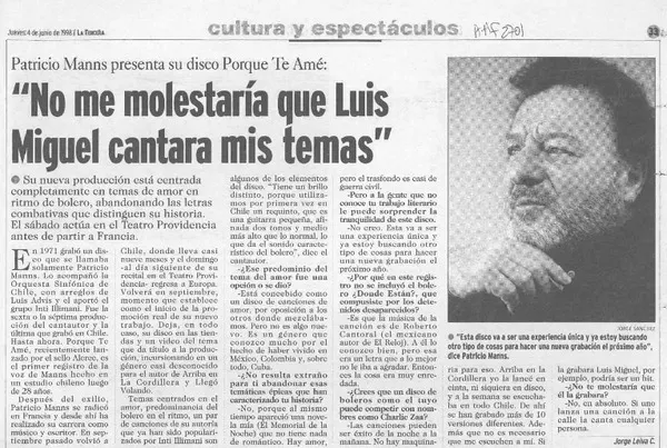 "No me molestaría que Luis Miguel cantara mis temas" [entrevista] [artículo] : Jorge Leiva C.