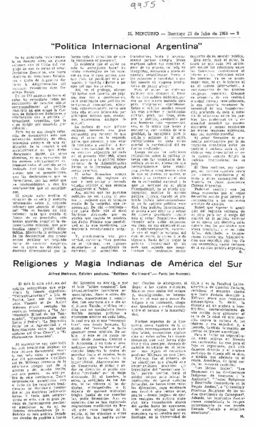 "Política Internacional Argentina" Religiones y magias Indianas de América del Sur. [artículo] :