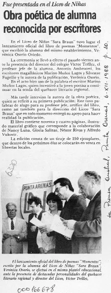 Obra poética de alumna reconocida por escritores [artículo]. retr.