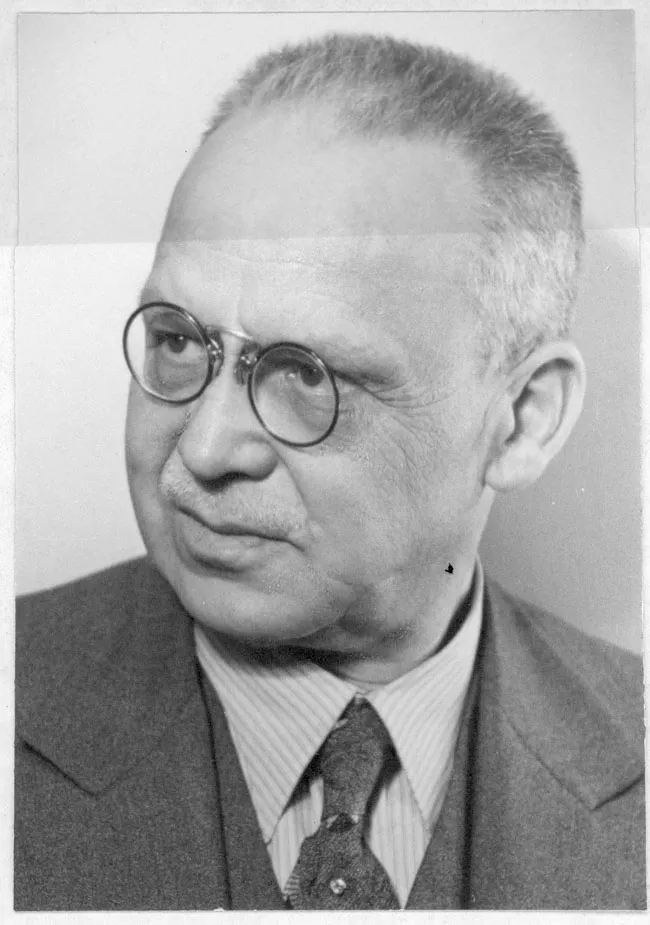 Positivo papel copia, monocromo, estructura formal retrato individual, especialidad fotográfica registro. Hombre canoso con lentes y barba. Vista chaleco oscuro, corbata y camisa.