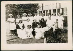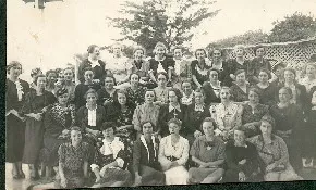 Retrato grupal femenino grupo de 43 damas elegantemente vestidas en un jardín, un gran árbol ... 03SDF-25-6724