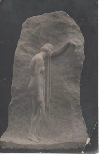 Fotografía rectangular con orientación vertical en monocromo de una mujer de pie y cuerpo entero. Posa de espalda con su mirada en dirección izquierda de la imagen. Usa vestido color claro y largo. Apoya sus maños sobre una mesa de madera contorneada que se encuentra delante de ella.