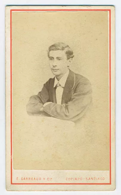 Reproducción fotográfica rectangular, orientación vertical en blanco y negro de hombre joven con vestimenta de marino. Se encuentra de pie, erguido y de frente.Fondo claro sin decoración.