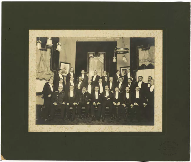 Formato rectangular. Retrato grupal. Figuras masculinas de hombres pos...