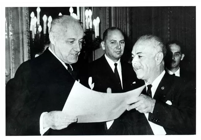 Reproducción fotográfica, orientación vertical en blanco y negro de una pintura de caballete en la que se representa a un hombre en plano medio vestido con traje oscuro y camisa cuello alto. Sostiene con su mano izquierda un guante blanco, con la derecha se apoya sobre un libro que se encuentra sobre una mesa a su costado.
