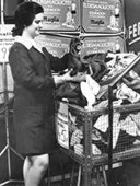 Fotografía rectangular, vertical, monocromo de una mujer de cuerpo ent...