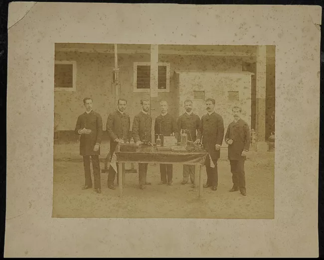 Retrato grupal de grupo científico con Manuel Barros Borgoño.