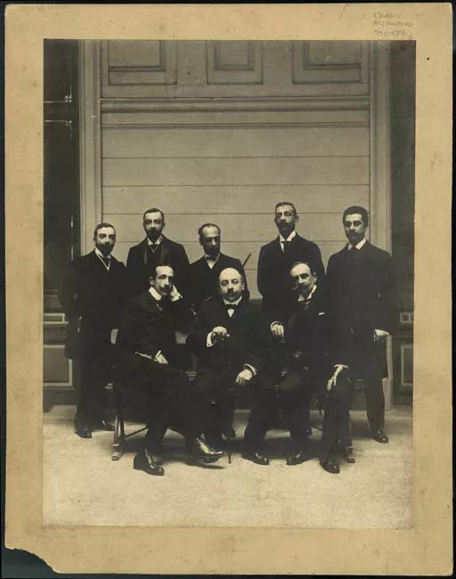 Fotografía rectangular, orientación vertical en blanco y negro de una mujer en sentada usando un abultado vestido color oscuro con rombos en el faldón. Usa su cabello recogido y a su costado izquierdo se asoma parte de una mesa de madera tallada y una cortina color claro. Fondo claro sin decoración.