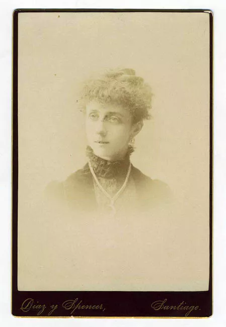 Imagen de mujer sentada con vestido oscuro y manta oscura con un broch...