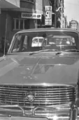 Composición en base a figura femenina adulta mayor de tres cuartos, sentada de medio perfil hacia su derecha. Usa capa y velo negro sujeto con un prendedor iluminado. Porta un estuche con dibujo de figura masculina.