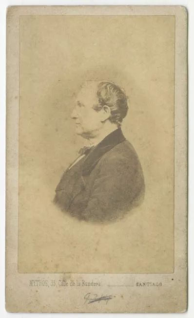 Estuche rectangular, de madera color marrón oscura, forrado en cuero y terciopelo. Al centro se encuentra inciso el escudo de Chile y la firma del retratista en bajo relieve y dorado. Contratapa color beige y dos broches metálicos en el costado derecho.