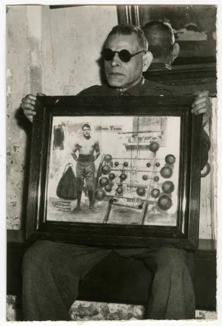 Fotografía blanco y negro de hombre de lentes y traje oscuro. Sostiene...