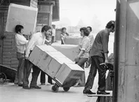 Objeto bidimensional de forma rectangular, dispuesto horizontalmente. La imagen monocroma con borde negro, representa un grupo de personajes masculinos observando una vitrina con televisores.