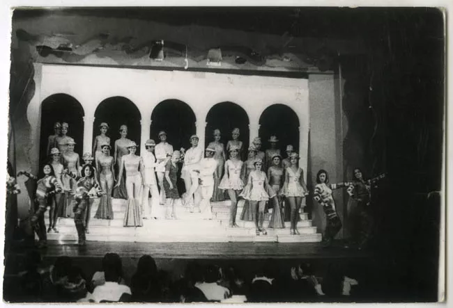 Grupo de hombres posando de edades variadas, con traje elegante, en habitación de tres ventanas con cortinajes iguales y decorados en el borde superior del muro. Dos lámparas colgantes.